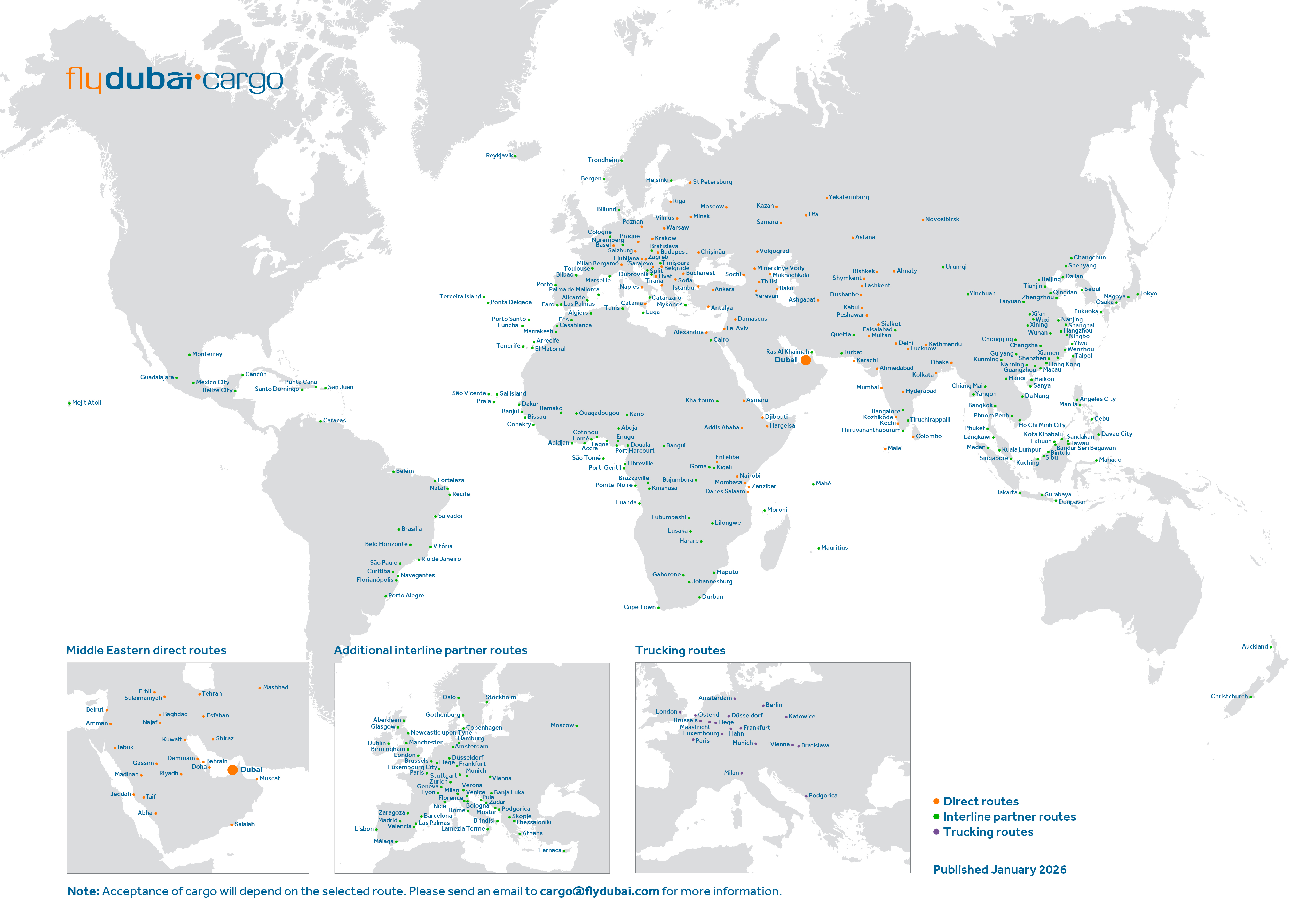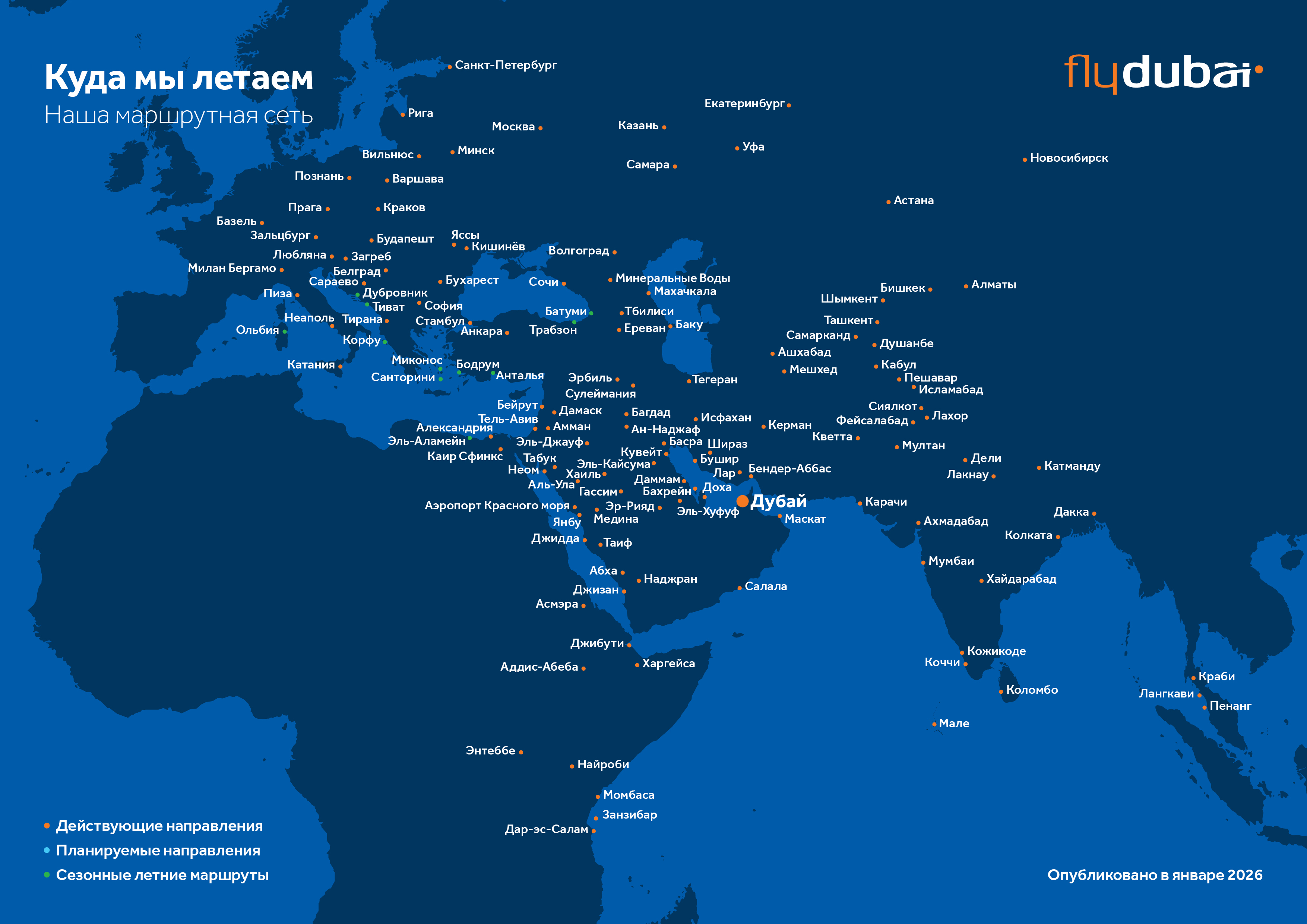 Обслуживание неохваченных рынков: рейсы в более чем 100 городов, ранее не имевших прямого воздушного сообщения с Дубаем или не обслуживаемых национальными перевозчиками ОАЭ из Дубая.